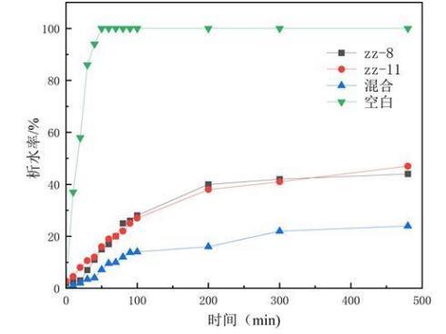 图5是实施例1乳化性能测试中ZZ-11、ZZ-8、混合菌剂析水率曲线图。