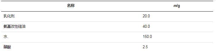 氨基改性硅油在未经乳化处理之前,通常为一种油状或半固态的物质,不易与水相混合。而氨基改性硅油柔软剂需要在水中分散均匀,才能被纺织物充分吸收和利用,发挥柔软、抗静电等作用。因此,上述步骤下制得的氨基改性硅油还需要进一步的乳化处理,才能形成氨基改性硅油柔软剂,否则不能发挥柔软剂的作用,反而还会损伤纺织物。室温下,将乳化剂、氨基改性硅油、醋酸与水按照一定的比例混合,然后200 r/min搅拌5 min,即可制成氨基改性硅油柔软剂。乳化方案中各物质比例见表1。