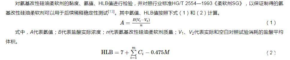 对氨基改性硅油柔软剂的黏度、氨值、HLB值进行检验,并对照行业标准HG/T 2554—1993《柔软剂SG》,以保证制得的氨基改性硅油柔软剂可以用于后续稀释稳定性测试。其中氨值、HLB值按照下式(1)和(2)计算。