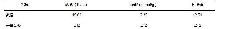 氨基改性硅油柔软剂表征测试结果见表2。由表2可知,氨基改性硅油柔软剂的黏度、氨值、HLB值均合格。