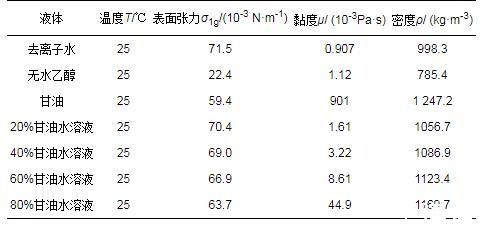 实验所用物质的物性参数和实验条件如表1、2所示,其中US为平面的运动速度,UD为液滴的撞击速度。