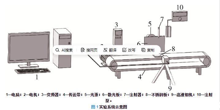 1—电脑;2—电机;3—变频器;4—传送带;5—光源;6—散光板;7—注射器;8—不锈钢板;9—高速相机;10—注射泵。