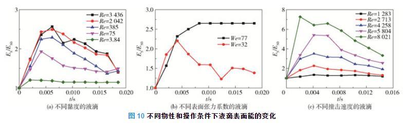 图10为不同物性和操作条件下液滴表面能的变化。由图4(a)、图7(a)和式(19)均可得到液滴铺展直径和铺展面积随时间先增大后减小的一般规律,且随着黏度的增加,液滴的铺展直径和铺展面积均减小,液滴表面能增加的速率也在降低。