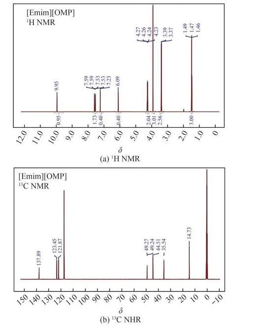 图1 1-乙基-3-甲基咪唑亚磷酸甲酯盐的核磁共振氢谱图和碳谱图
