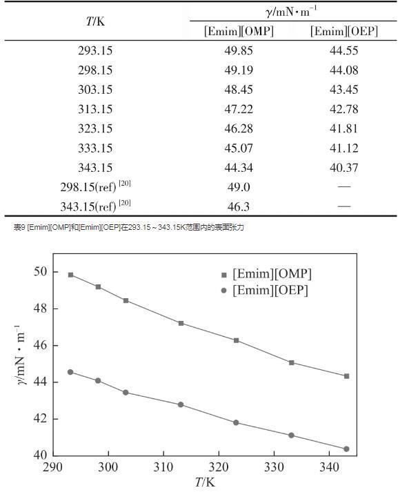 表面张力是一个对自由表面的物理和化学研究非常重要的性质,大部分离子液体的表面张力在30~60mN/m之间。[Emim][OMP]和[Emim][OEP]的表面张力实验值如表9和图5所示。对于亚磷酸酯离子液体,[Emim][OMP]在某论文中报道的其表面张力数据与本文最大偏差值达到了1.96mN/m。分析原因在于不同的课题组使用不同的测量方法测量表面张力,从而使测量实验值产生较大的偏差。因此,对于表面张力的测定,要达到准确可靠且具有复现性存在一定难度。
