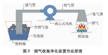 烟气收集净化装置主要由置液桶、通气管、离心式风机、吸气管、集气罩和燃油池等组成,其净烟工作原理如图3所示。风机抽走集气罩下燃油池中汽油燃烧的黑烟,将其通入桶内发泡液中;气体进入液体后会立刻浮出液面,在液体表面张力作用下排出液面的烟气被液膜包裹成含烟气泡;随着烟气不断被通入发泡液中,含烟泡泡很快就溢满整个置液桶。实验前测量并记录水及发泡液的pH值。