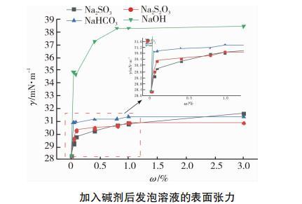 图4是不同质量分数碱剂发泡液表面张力的测试结果。强碱NaOH使发泡液表面张力明显提高,在NaOH质量分数3%时达到最大值38.3mN/m,随后发泡液表面张力值保持稳定,不受NaOH含量变化影响。说明NaOH浓度升高时OH-过多,造成图4加入碱剂后发泡溶液的表面张力表面活性物质停留于溶液表面,阻碍了OH-与更多表面活性物质的反应机会,溶液表面张力不再受影响。图4中弱碱Na2S2O3,NaHCO3变化规律与NaOH相似,低浓度时发泡液表面张力激增,达到质量分数0.8%之后,表面张力值增幅减缓。NaOH加入使发泡液表面张力增加了35.7%,而其他3种弱碱无机盐在浓度最大时(质量分数3%)仅增加约10%.与强碱剂相比,弱碱剂对溶液表面张力影响较小。