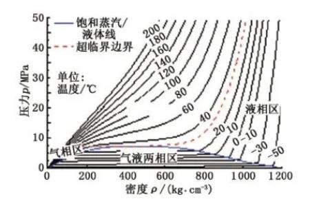 表面活性剂水溶液的密度与纯水体系相近,其密度根据饱和水蒸气温度-压力-密度-热力学参数对照表确定,CO2密度与压力温度的关系见图3。