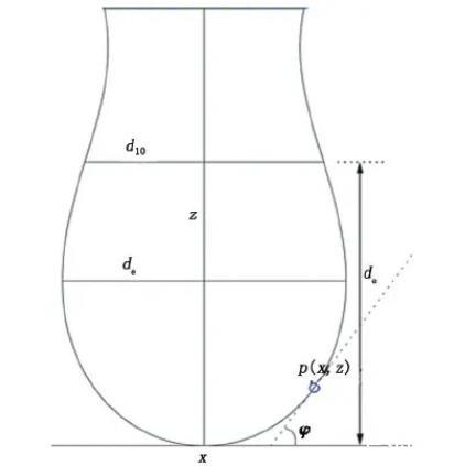 悬滴法测定液体的表面和界面张力原理见图5。其中,de为悬滴最大直径;d10为离顶点距离为de处悬滴截面直径。