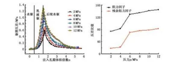 (3)随着压力的升高,阻力因子和残余阻力因子均逐渐增加,在压力由4 MPa升至8 MPa过程中,阻力因子大幅增加,压力的升高使岩心封堵过程中的最高压差提前出现。