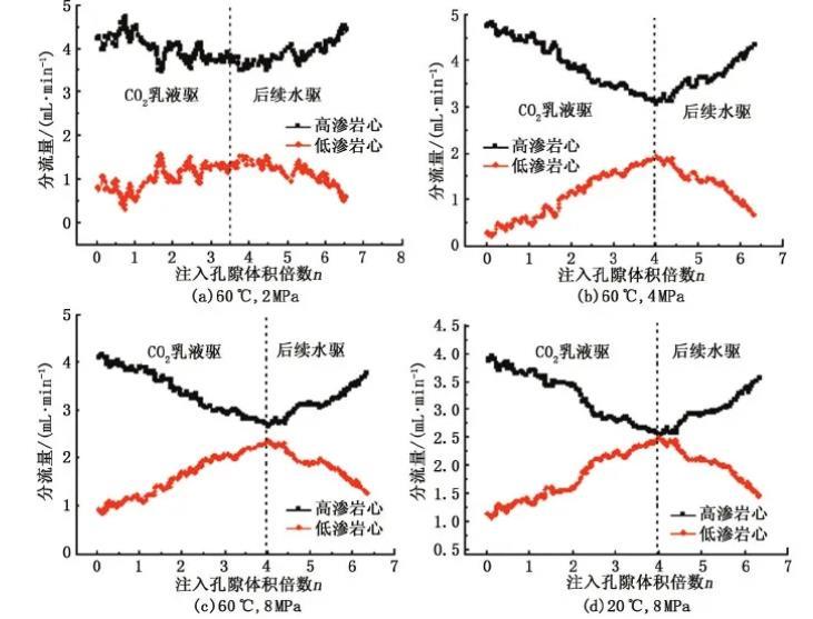 相比于高渗岩心,低渗岩心中由于毛管力较大,使得CO2乳液液滴与液膜之间的压差大,导致CO2乳液易发生破裂而形成气窜,减弱了CO2乳液的封堵性能,从而降低了流动阻力,同时乳液更倾向于进入高渗岩心,在岩心渗流过程中叠加的贾敏效应会使高渗岩心的渗流阻力不断增加,直至大于低渗岩心的渗流阻力,依据这一机制CO2乳液能够实现分流作用。