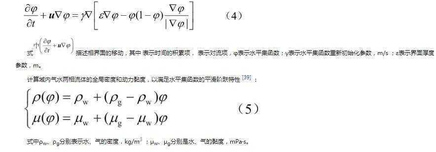 式描述相界面的移动,其中表示时间的积累项,表示对流项,φ表示水平集函数;γ表示水平集函数重新初始化参数,m/s;ε表示界面厚度参数,m。