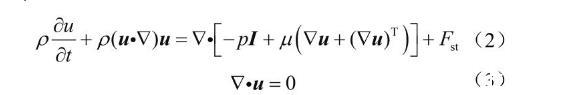 式中ρ表示流体密度,kg/m3;u表示速度矢量,m/s;p表示压力,Pa;I表示单位矩阵;μ表示流体的动力黏度,mPa·s;Fst表示气水两相的界面张力,N/m。