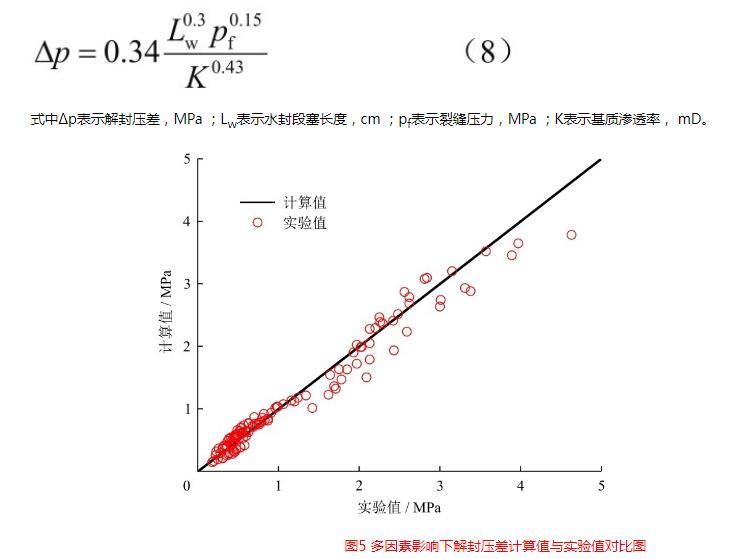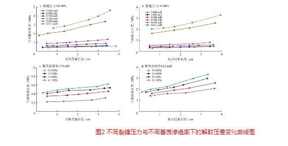 式中Δp表示解封压差,MPa;Lw表示水封段塞长度,cm;pf表示裂缝压力,MPa;K表示基质渗透率,mD。