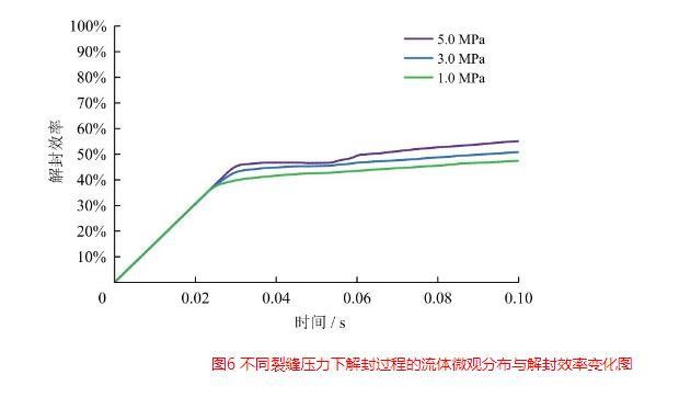 图6不同裂缝压力下解封过程的流体微观分布与解封效率变化图