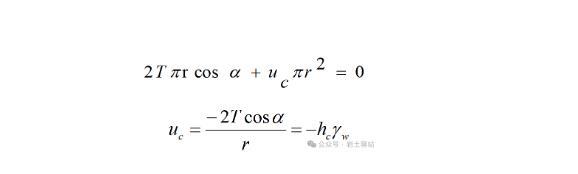 来自《土力学》式中,水膜张力T与温度有关,单位:N/cm或KN/m;10°时,T=7.41×10-4N/cm=7.41×10-5KN/m;方向与毛细管成夹角α,该角度的大小与土颗粒矿物成分和水性质有关;