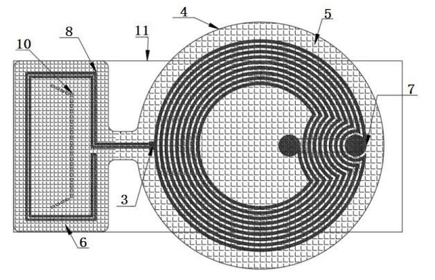 作为本发明的一种优选技术方案:若射频芯片为具有侦测功能的射频芯片,则由射频芯片的射频端口连接布设于承载基材表面的第一走线,由第一走线在承载基材其中一端的表面上构成射频辐射结构,并且由射频芯片的侦测端口连接布设于承载基材表面的第二走线,由第二走线在承载基材另一端的表面上构成侦测结构;