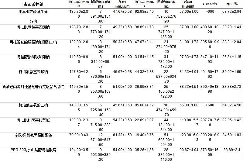 本研究除了测试表面活性剂溶液的表面张力、泡沫形态、泡沫密度保留率(ηBC)和泡沫体积保留率(ηV)外,还测试了最大泡沫含液量(Vliquid foam max)、析液半衰期(tFLS 50%)、气泡个数半衰期(tBC1/2)、泡沫液体体积比率(MD)等指标,结果如表4和表5所示。