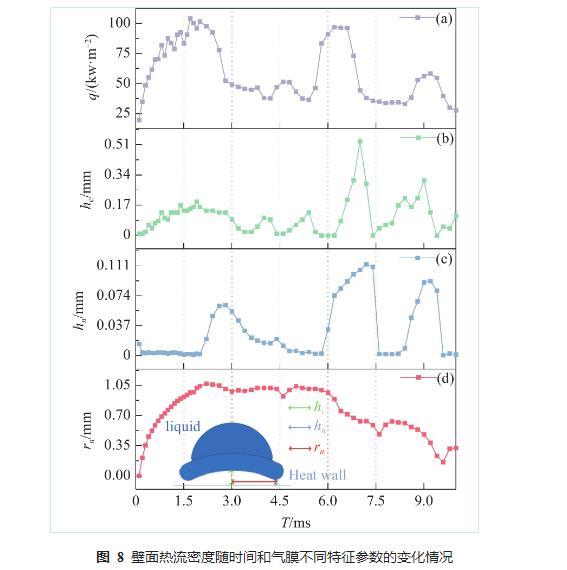 从图7可以看出,相对于压强的变化情况,壁面的热流密度与气膜的相关性更强,气膜厚度的变化会引起热流密度的变化。图8是液滴撞击过程中壁面平均热流密度及气膜不同特征参数随时间的变化情况,图8(a)是壁面平均热流密度,可以看出,平均热流密度的变化情况受液滴中心气膜厚度影响较大,在前期铺展阶段中心气膜厚度出现明显波动时热流密度也相应波动,在液滴收缩阶段,热流密度变化明显与颈部气膜厚度成正相关;图8(b)是液滴中心气膜高度,中心气膜高度波动最为剧烈,在液滴撞击前3 ms内,即液滴铺展阶段先伴随不稳定波动升高再保持稳定,当液滴开始收缩时出现大范围的波动;图8(c)是液滴颈部气膜厚度,颈部与中心点通常为液滴底部气膜厚度最薄点,也是热流密度峰值点;图8(d)是液滴的颈部半径长度,它的变化规律与液滴铺展情况相似,且可以用来表示液滴与壁面的有效换热面积。相较其他两项特征参数而言,液滴中心气膜厚度显然对热力学能具有更高的影响。