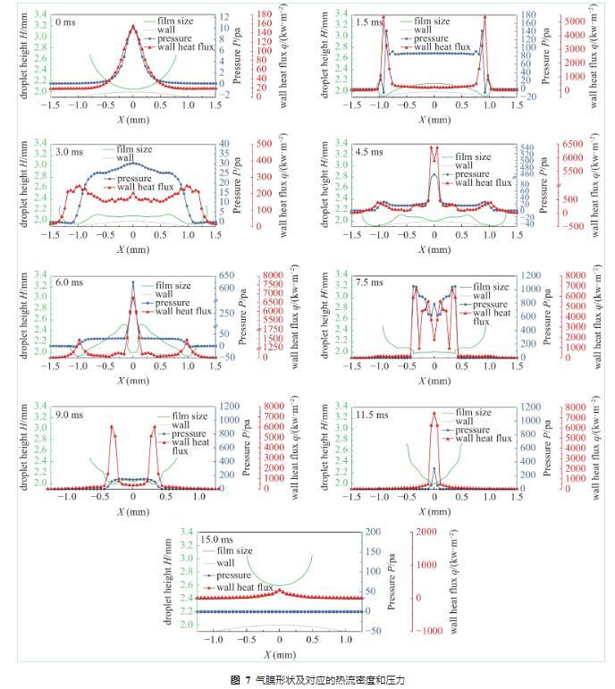 液滴撞击球面时会出现两个压力及热流密度较高的区域,分别是液滴中心和液滴颈部,这两个位置因为压力较高使气膜厚度变薄,导致热流密度升高。高压力也会使该区域的气流速度加快,但液滴与壁面间的蒸汽在排出时会形成泊肃叶流,对排气速度产生一定的影响。对于气膜来说,通常以中心高度、颈部半径和颈部高度三项特征参数加以表征,对热流密度影响较大的是中心气膜高度。