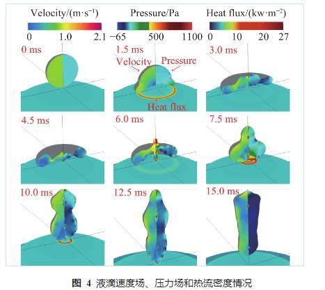 图4液滴速度场、压力场和热流密度情况
