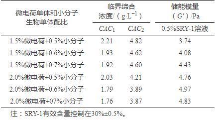 室内合成实验研究发现,微电荷单体对降低CAC2贡献较大,用量优选为1.5%~2.5%,而小分子生物单体对降低CAC1贡献较大,用量优选为0.5%~0.7%,两种单体共同作用下临界缔合浓度降低和黏弹性提高显著,最优结果见表3。可见当采用2.0%微电荷单体+0.6%小分子生物单体组合时,溶液具有较强的黏弹性,此时SRY-1的CAC1,CAC2分别为1.79 g·L−1、3.89 g·L−1,对应SRY-1用量接近0.18%、0.4%。