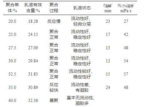 乳液中聚合物有效含量越高,增黏能力越强,使用成本越低,聚合单体浓度直接决定乳液有效含量,并通过影响聚合反应过程进而影响减阻剂综合性能。