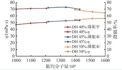 图2不同分子量0.5%SRY-1溶液的表观黏度和降阻率