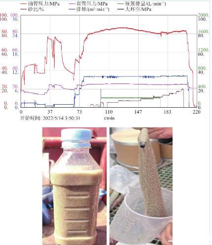 图8 DK**-**24井第4段压裂施工曲线及携砂液展示