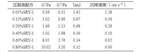 数据表明,压裂液沉降速度与Tanδ的变化趋势基本一致:当SRY-1浓度远小于CAC1(0.18%)时,G'很小,Tanδ>1,支撑剂沉降速度很快;当SRY-1浓度逐渐接近CAC1,G'超过G″,Tanδ<1,支撑剂沉降速度明显降低;当SRY-1浓度逐渐接近CAC2(0.4%),G'远大于G″,支撑剂沉降速度慢;当SRY-1浓度超过CAC2,G′、G″持续增大,弹性明显大于黏性,Tanδ<<1并且趋于稳定,支撑剂基本不沉降(沉降速度为0)。因此G′、G″和Tanδ结合可以很好地表征不同浓度范围内压裂液的悬砂能力,中黏液(0.4%)Tanδ小于0.4就具有良好的携砂性能,支撑剂沉降速率低至0.1 cm·s−1。可以发现,在配方设计范围内,超过CAC1浓度后压裂液弹性的增加幅度明显大于黏性,为实现低黏高弹性,高减阻强携砂提供了可能性。