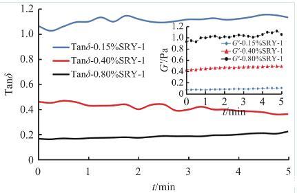 黏弹性是指流体对施加外力的响应,表现为黏性和弹性双重特性,通常用G′表征弹性模量,G″表征黏性模量,而G″与G′的比值记作Tanδ,用于表征流体黏弹性的强弱:随Tanδ由大到小变化,流体黏弹特性越明显,Tanδ>1时,流体流动性强,Tanδ<1时,流体结构性强。对0.15%、0.4%、0.8%SRY-1的压裂液进行了黏弹性测试(利用RS6000流变仪锥板测试系统进行定频率定应力扫描实验,测试得到的弹性模量G′、Tanδ变化情况见图6所示。