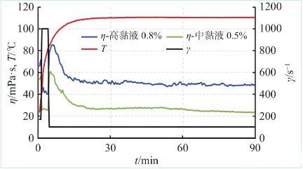 充分模拟在线施工以及大排量对压裂液高剪切的情况,设置好流变测试条件,110℃,170 s−1剪切1 min(模拟地面),然后1000 s−1剪切3 min(模拟井筒中12 m3/min排量),再100 s−1剪切86 min(模拟裂缝中);按照配方配制压裂液,搅拌1 min后立即取测试样转入流变仪测试,测试结果见图5。压裂液经过1000 s−1的高剪切后黏度能迅速恢复,随温度升高黏度下降较快,但当温度达到110℃恒定后黏度基本稳定,高黏液(0.8%)表观黏度保持在45~50 mPa·s之间,可以满足前置液造缝和携砂要求;中黏液(0.5%)表观黏度保持在20~25 mPa·s之间,低黏高弹性特征依然能满足长时间压裂加砂要求。