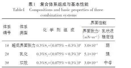 界面张力按照设定浓度分别配制超低界面张力、乳化和双效复合体系(表1),在70°C下利用界面张力仪,测试其与目标稠油的界面张力。