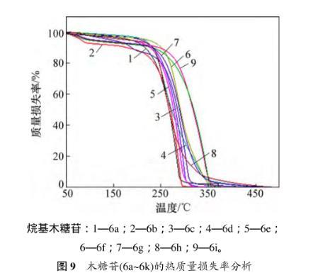 图9所示为热质量损失结果。从图9可见:烷基吡喃木糖苷6a~6i均只有1个质量损失台阶,起始分解温度分别为157.9,177.3,172.6,162.3,164.1,169.5,151.7,170.4和208.9℃左右,最大分解速率时的温度依次为283.2,287.8,296.6,257.9,290.4,286.1,301.9,262.7和339.8℃。糖苷6a~6i热分解完时的温度分别为303.1,298.1,329.6,365.5,320.4,340.2,332.0,374.6和356.2℃。总质量损失率为94.9%,89.9%,91.0%,91.9%,95.3%,96.6%,89.6%,88.5%和91.5%。结果表明:合成的烷基吡喃木糖苷在150℃以下是稳定的。