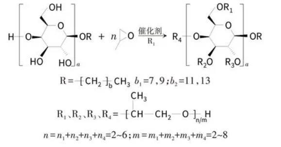 制备路线:烷基糖苷分子中含4个羟基,与环氧丙烷在催化剂作用下发生反应: