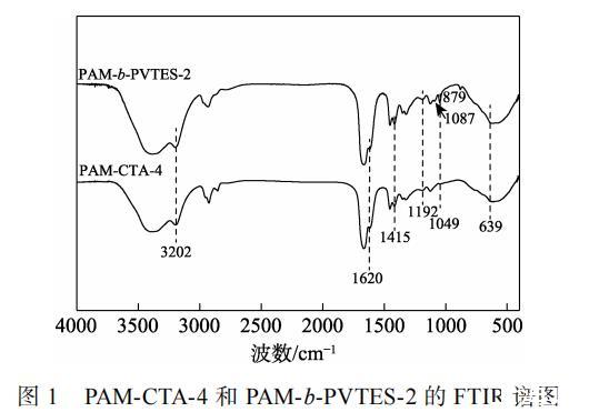 图1为聚合物的FTIR谱图。由图1可知,对于PAM-CTA-4,3202 cm–1处为—NH2的伸缩振动吸收峰,1620 cm–1处为C==O键的伸缩振动吸收峰,1192 cm–1处的吸收峰为C—S键的伸缩振动,1049 cm–1处的吸收峰为C==S键的伸缩振动,1415 cm–1处的吸收峰归属于苯环骨架的伸缩振动,639 cm–1处的吸收峰为苯环上单取代的特征峰,表明聚合物PAM-CTA-4已经成功制备。在PAM-b-PVTES-2的FTIR谱图中,879 cm–1处为Si—C键的伸缩振动吸收峰,1087 cm–1处为Si—O键的伸缩振动吸收峰,表明聚合物已成功制备。