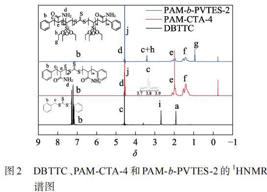 图2为DBTTC、PAM-CTA-4和PAM-b-PVTES-2的1HNMR谱图。如图2所示,DBTTC的1HNMR谱图曲线中δ=1.92(a)为氘代丙酮的质子峰,δ=7.13~7.31(b)是苯环上的质子峰;δ=4.56(c)的峰为亚甲基(—CH2—)的质子峰;δ=2.62(i)为DBTTC样品中含有的极少量H2O的质子峰,可以确定成功合成了RAFT试剂DBTTC。PAM-CTA-4和PAM-b-PVTES-2的1HNMR谱图曲线中,δ=4.80(j)为重水(D2O)的质子峰;δ=7.27~7.48(b)是苯环上的质子峰;δ=4.82(d)为酰胺基(—NH2)的质子峰;δ=1.95~2.24(e)是主链上的次甲基(—CH—)的质子峰;δ=1.31~1.66(f)是主链上的亚甲基(—CH2—)的质子峰。在PAM-CTA-4曲线中,δ=3.78~3.82(c)为与苯环相连亚甲基的质子峰。PAM-b-PVTES-2曲线中δ=3.39~3.43(c+h)为与苯环相连和乙烯基中的亚甲基(—CH2—)质子峰;δ=0.93~0.95(g)为有机硅中甲基(—CH3)的质子峰。通过FTIR谱图和1HNMR谱图可以确定合成了PAM-CTA-4和PAM-b-PVTES-2。