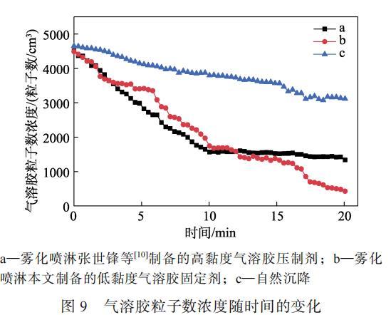 将张世锋等制备的高黏度气溶胶压制剂(黏度2502 mPa·s)和本文制备的低黏度气溶胶固定剂(选取PAM-b-PVTE-2配制成20%固含量,黏度7.2 mPa·s)进行雾化喷淋实验,并对粒径范围在0.5~20μm的气溶胶颗粒进行检测,结果如图9所示。