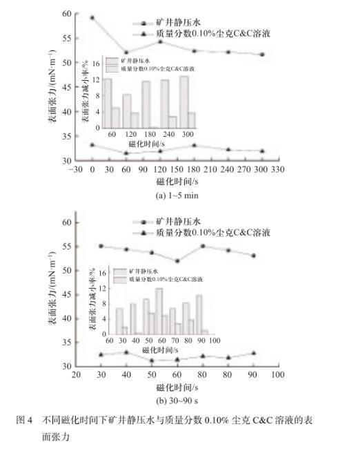 图4不同磁化时间下矿井静压水与质量分数0.10%尘克C&C溶液的表面张力