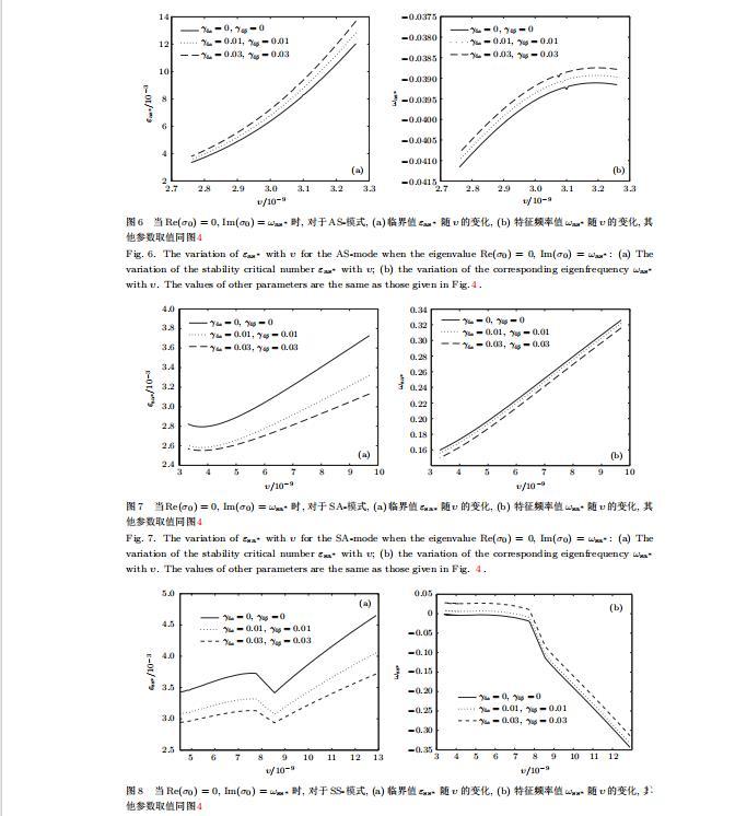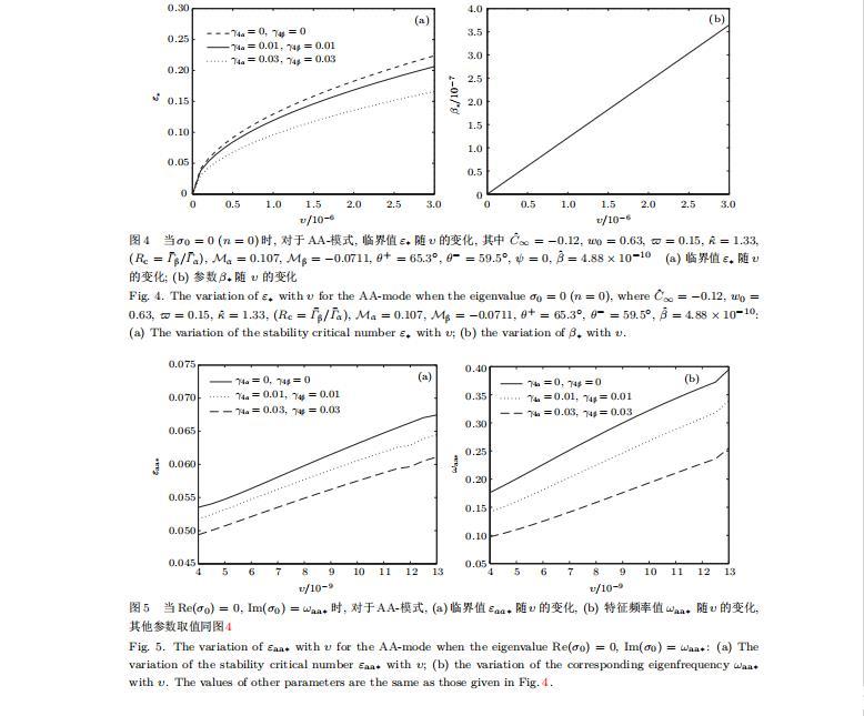 由量子化条件可以看出特征值σ0是关于参数ε和γ4的隐函数.任意给定参数ε和γ4,可以得到一个复数值σ0.为了更好地阐明生长条件对共晶生长系统的影响,引入无量纲参数[11,12]υ=ℓc,αV/κD,它反映拉速V的大小;ˆβ=−ℓc,α(G)D/mαCe,它反映温度梯度(G)D的大小.通过化简可以知道,υ=ε3¯Γα,ˆβ=υG/M.本文采用与Xu[23]研究枝晶的形态稳定性相似的方法,对于四种震荡模式得到各自对应的稳定临界值εaa∗,εas∗,εsa∗和εss∗.共晶生长系统稳定的选择判据为: