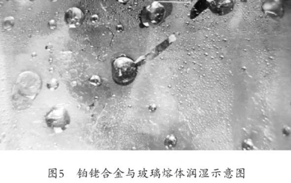 由于润湿问题首先可排除铂铑合金材料,在实验室熔制玻璃常用铂铑合金坩埚,铂铑合金与玻璃熔体呈润湿状态,如图5所示,玻璃熔体呈扁平状不能成球。