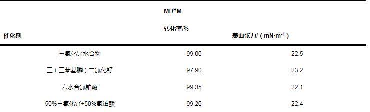 分别以三氯化钌、三(三苯基膦)二氯化钌、六水合氯铂酸和50%三氯化钌+50%氯铂酸为催化剂,在以下条件下合成BEOTSS:催化剂用量30 mg/kg(以Ru或Pt质量计),n(BEO)∶n(MDHM)=1.05∶1,反应时间6.0 h,反应温度100℃。测定MDHM转化率以及0.1%BEOTSS水溶液的表面张力,结果如表1所示。可以看出,这几种催化剂的效果均较好,MDHM转化率在97%以上,表面张力低于24 mN/m。其中,三氯化钌的催化效果与传统的氯铂酸相差不大,只是所得产物为黄色液体,比氯铂酸的产物颜色深。考虑到三氯化钌价格比氯铂酸便宜很多,因此采用三氯化钌作为催化剂具有很好的成本优势。