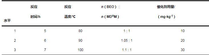 根据以上单因素影响的分析结果,本文采用正交试验优化BEOTSS的合成工艺条件。以反应时间(A)、反应温度(B)、n(BEO)∶n(MDHM)(C)、催化剂用量(D)为影响因素,MDHM转化率为评价指标,采用L9(34)进行正交试验,因素水平见表2,试验方案及结果见表3。