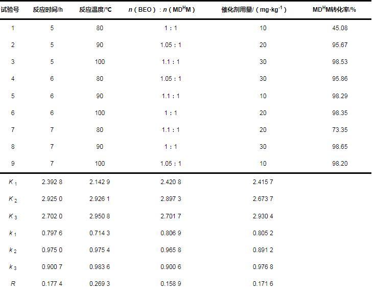 根据极差R的大小,确定各因素对反应转化率影响的大小顺序为:反应温度B>反应时间A>催化剂用量D>原料配比C。通过正交试验结果确定钌催化合成工艺的最优方案为A 2 B 3 C 2 D 3,即反应时间6.0 h、反应温度100℃、n(BEO)∶n(MDHM)为1.05∶1、催化剂用量30 mg/kg。