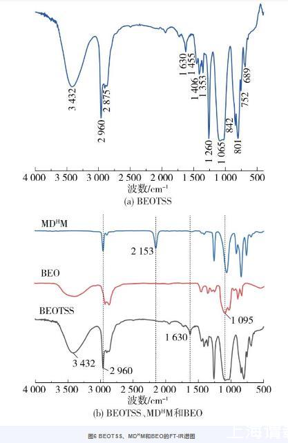 图6(a)为BEOTSS的红外谱图。图中,3 432 cm-1处的吸收峰为CH2OH中—OH的伸缩振动峰,1 630 cm-1的吸收峰为目标产物中C=C的伸缩振动峰;2 960 cm-1和2 875 cm-1处的吸收峰分别为—CH3和—CH2—中C—H键的伸缩振动峰;1 260 cm-1、842 cm-1和752 cm-1处的吸收峰为—OSi(CH3)3的特征峰;1 065 cm-1处的吸收峰为聚醚基中C—O—C的伸缩振动峰,它与1 020~1 080 cm-1处特有的Si—O—Si伸缩振动峰部分重叠,引起Si—O—Si峰形发生不对称变化;1 353 cm-1和1 406 cm-1处的吸收峰为—CH2—中C—H键的变形振动峰。图6(b)为原料与产物的红外谱图比较。图中,3 432 cm-1处的吸收峰为—OH基团的特征峰,原料BEO与产物BEOTSS都有此峰,说明BEO的羟基没有与Si—H反应。MDHM中2 153 cm-1处的吸收峰为Si—H基团的特征峰,而BEO与BEOTSS均没有此峰,说明Si—H加成到BEO的C≡C键,形成C=C双键(其特征峰在1 630 cm-1处)。以上结果表明本研究成功合成了目标产物BEOTSS。