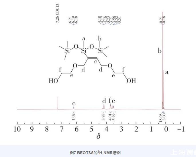 图7为BEOTSS的1H-NMR谱图。根据谱图中的化学位移及积分数据确定化合物中各基团的氢归属,得到以下结果:1H-NMR(400 MHz,CDCl3),δ=6.24~6.16(m,—C=CH—,1H),4.17(m,—CH 2CCHCH 2—,4H),3.72(d,J=5.6 Hz,—CH 2—OH,4H),3.54(t,J=14.6 Hz,—O—CH 2—,4H),0.21(s,—Si(CH 3)3,18H),0.18(s,—SiCH 3,3H)。由于使用氘代氯仿作为溶剂,产物中的2个—OH为活泼氢,在谱图中没有出峰,同时结合红外谱图分析,进一步证明本研究成功合成了目标化合物BEOTSS。