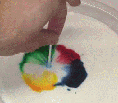 液体食品色素滴在牛奶上,然后把蘸了洗洁精的棉签杵进去,欣赏食品色素的流动。