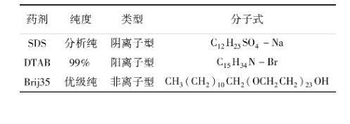 选用3种表面活性剂开展浮选精煤脱水过滤试验。3种表面活性剂分别为十二烷基硫酸钠(SDS)、十二烷基三甲基溴化铵(DTAB)、月桂醇聚氧乙烯醚(Brij35)。3种药剂的疏水端均为十二烷基,亲水端分别为硫酸根、铵根以及聚氧乙烯醚,3种药剂的物理化学性质见表3。