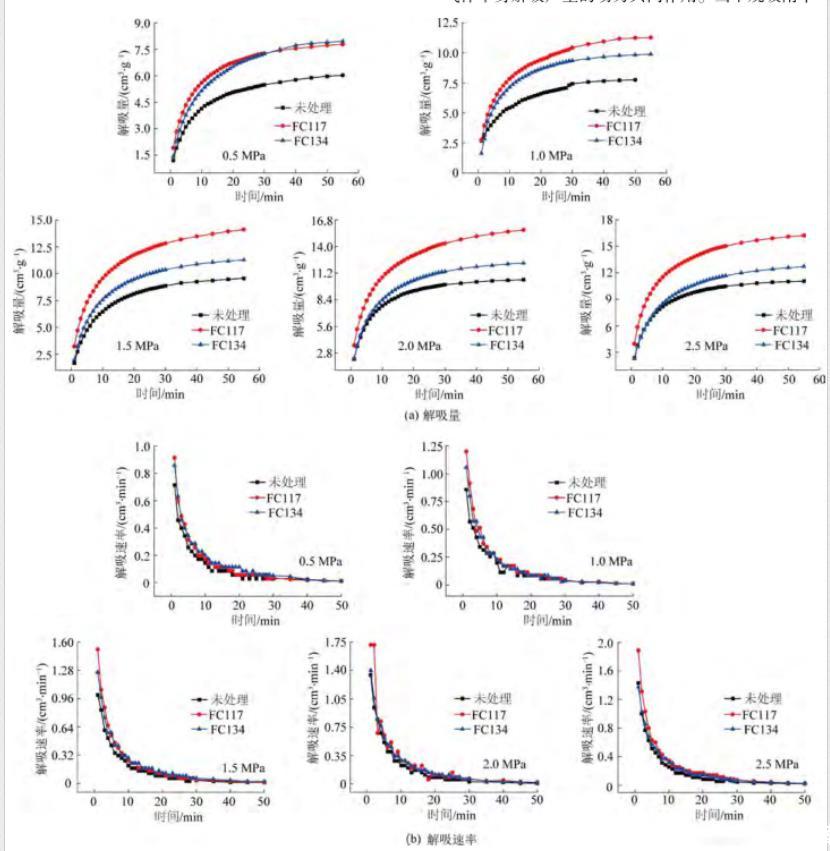 由图6b可知,随着甲烷吸附平衡压力的增加,3种处理方式的含水煤样解吸速率均有所增加。经过气润湿反转剂FC117和FC134处理后的煤样解吸速率也始终大于未处理的煤样。其中,表面活性剂FC117处理后的煤样解吸速率始终保持着显著的效果。同时,由于水锁效应产生的影响,不同处理方式的含水煤样解吸速率均小于干燥煤样的解吸速率。