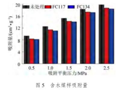由图5可知,随着甲烷吸附平衡压力的增加,气润湿反转剂处理前后煤样的吸附量均逐渐增加,且增加量均呈现逐渐减小趋势。经过气润湿反转剂FC117和FC134处理后的煤样吸附量始终小于未处理的煤样,其变化规律与干燥煤样的吸附量一致。其中,含水煤样的吸附量略小于干燥煤样的吸附量,其主要原因是在含水率为1%的煤样中,少量的水滞留在煤体内部。一方面,由于水的体积侵占了原本甲烷分子存在的空间;另一方面,由于煤样自身的亲水性,水在煤体表面的吸附能力强于甲烷气体,使得部分吸附状态的甲烷分子被置换和驱替。因此,含水煤样的甲烷吸附量略小于干燥煤样的吸附量。